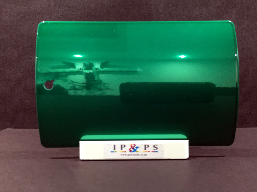 Professional restoration and powder coating of an alloy wheel in candy emerald green.